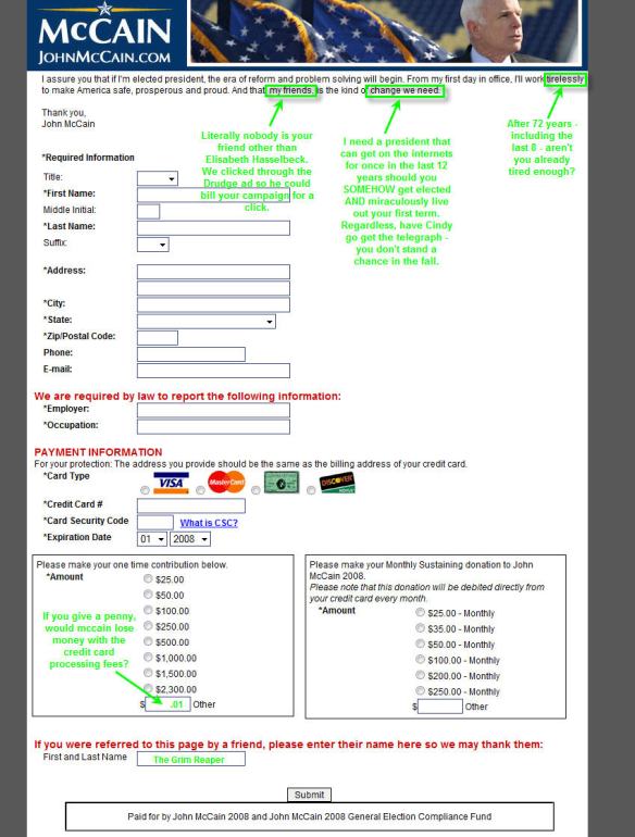 mccain Contribution Page – Marked-Up Posted on August 1, 2008 by "No Longer Mass Emailing" Click image below for a page chock-full of witty comments. If it looks blurry after you click through, left click on the image once more and it will be clear. Share this: Click to share on Facebook (Opens in new window) Facebook Click to share on X (Opens in new window) X Like Loading... Related