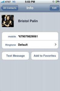 As seen originally on BccList.com here, bristol palin’s cellphone number (thank you yahoo account hacker) is (907) 982-9061. I took it to the next level last night on the train by adding her as a contact.