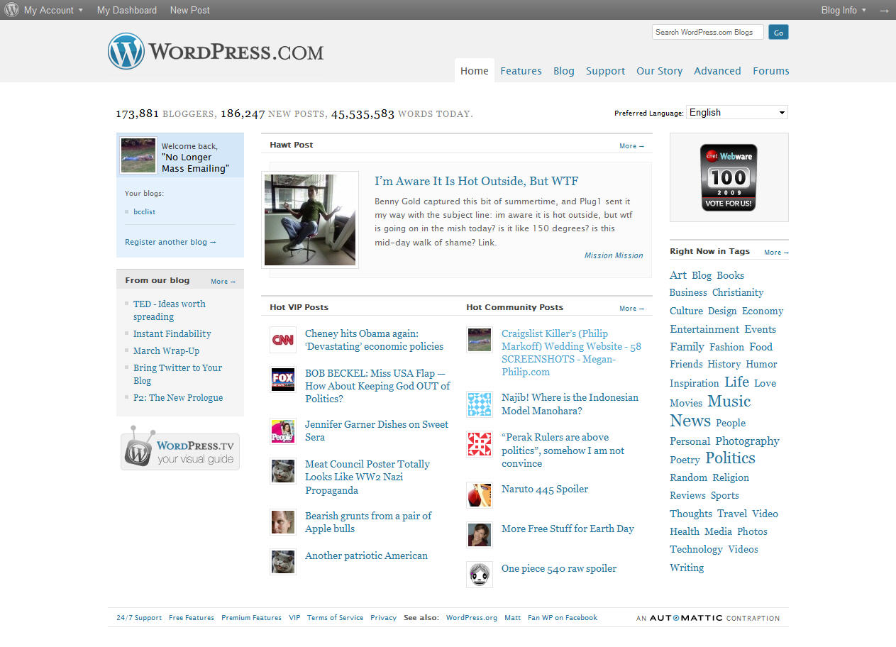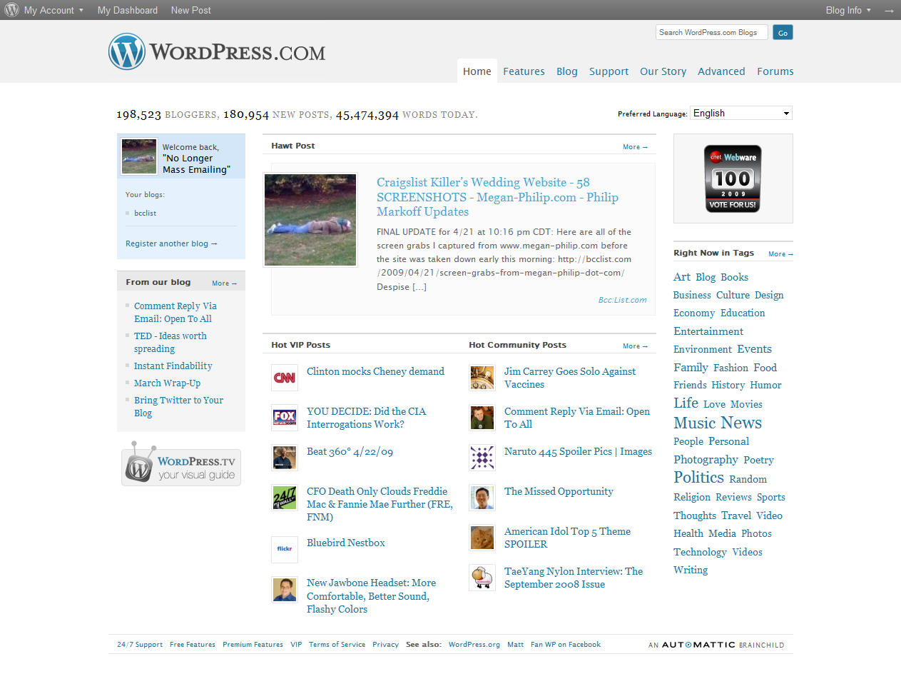Along with being mentioned in this blog posting on The Wall Street Journal, BccList.com has had the honor of being featured on WordPress.com’s homepage – see screenshots below.